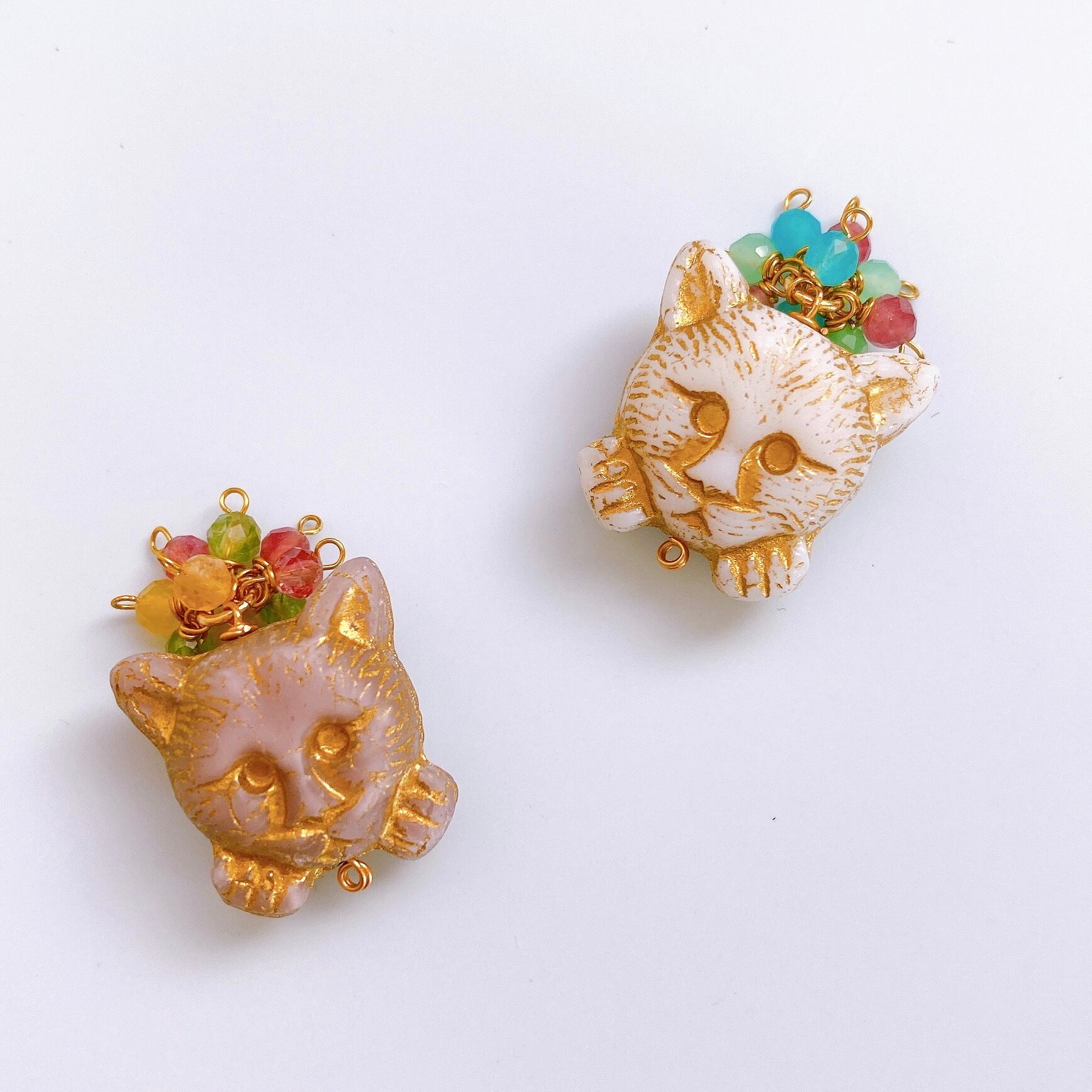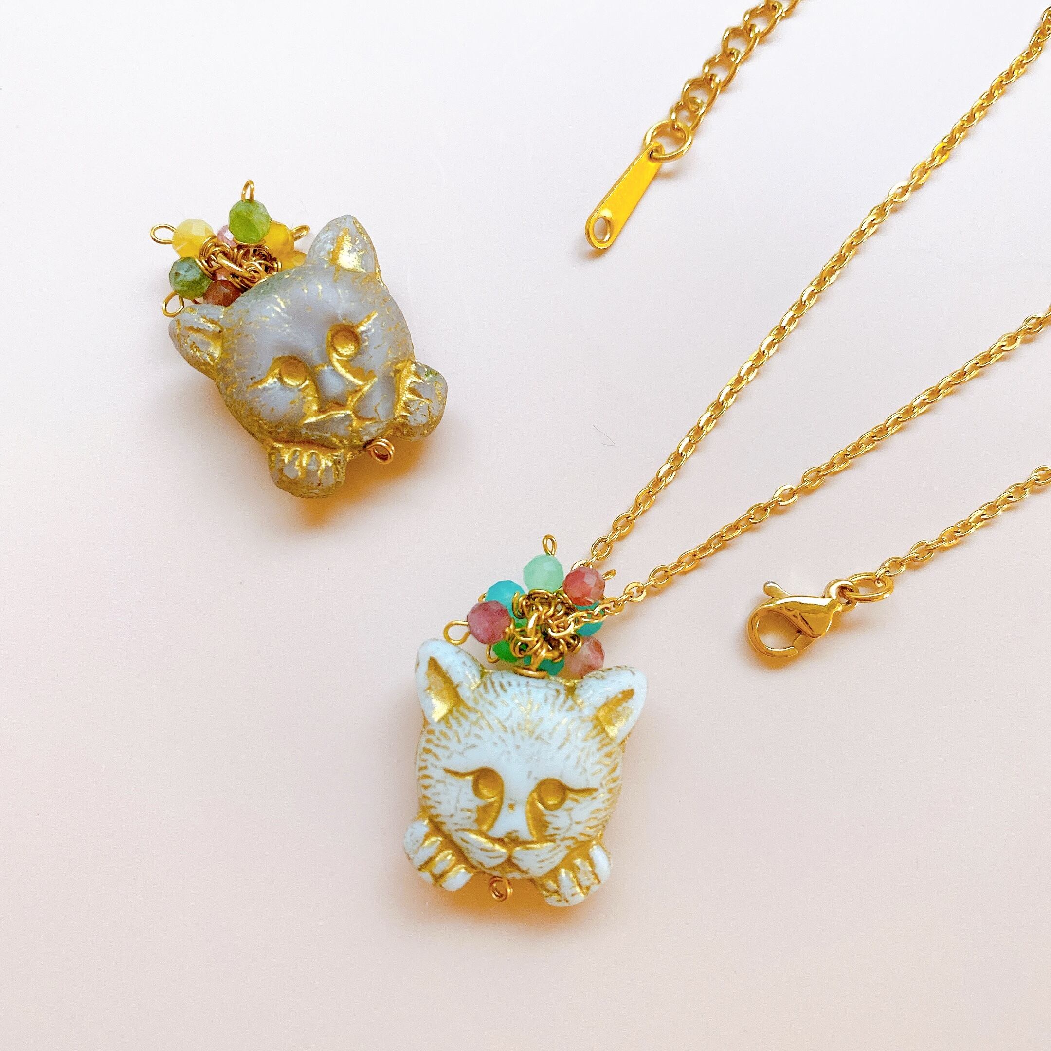 カラフルなの天然石の花冠をかぶった、大きく厚みのある猫顔のネックレスです。