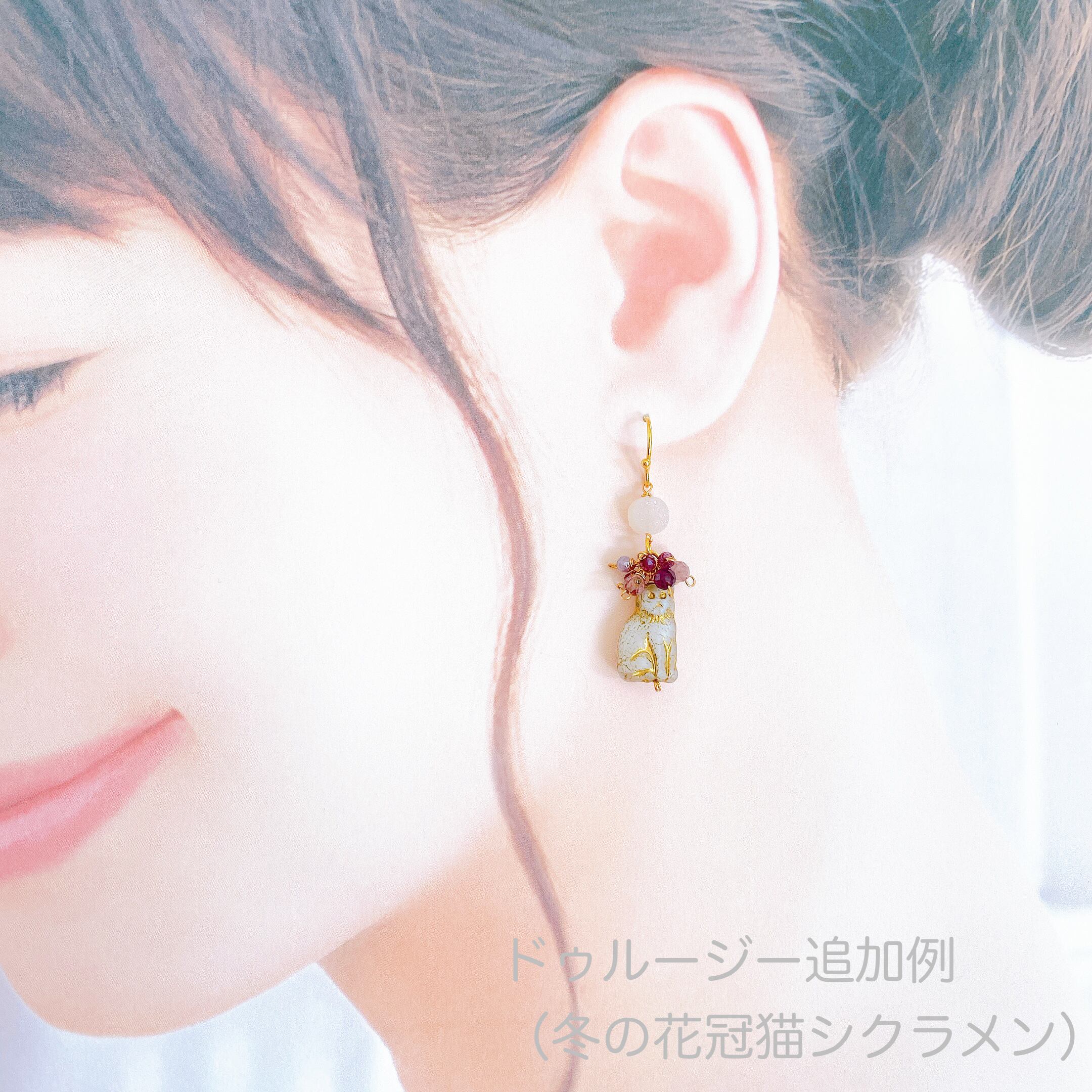 タッセルはお色と数量(片側か両側)、付ける位置(上部…花冠の位置。下部…猫の下)をお選びください。