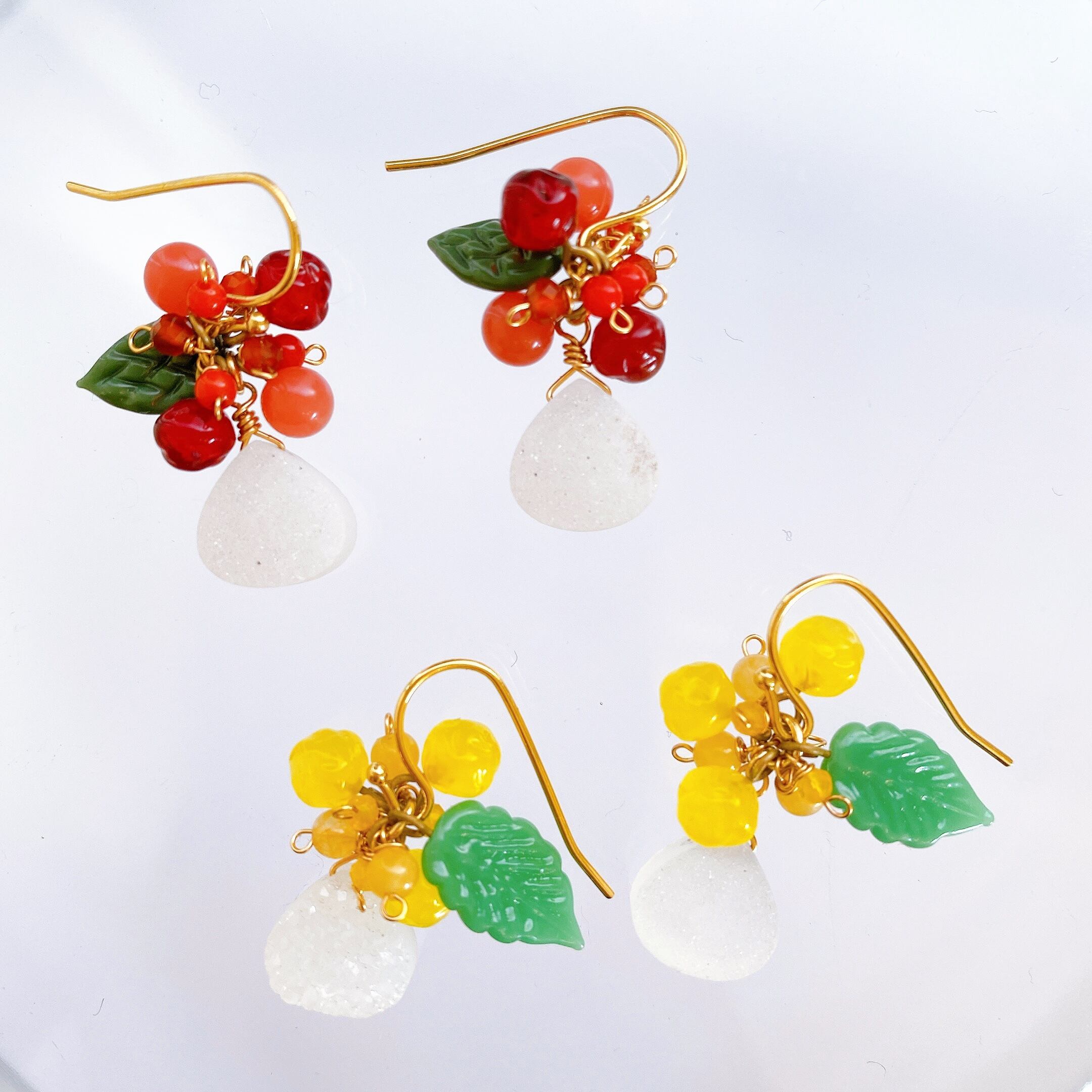 little lampsさんのハンドメイドのランプワークビーズ(実と葉っぱ)に天然石を合わせています。